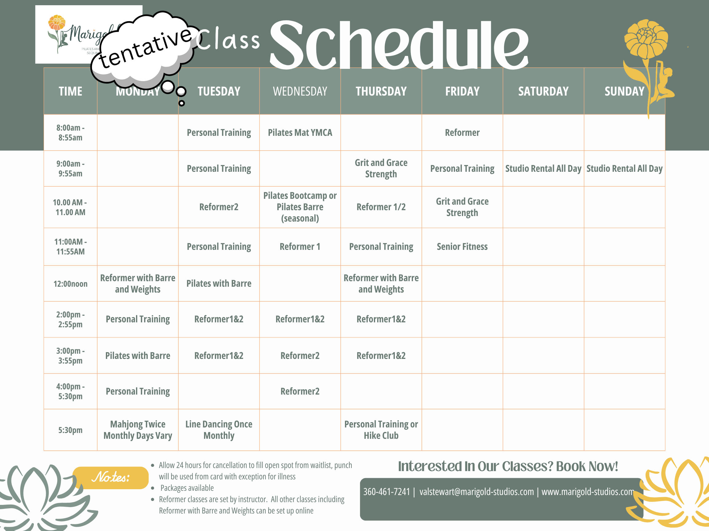 FOR NEW CUSTOMERS. Please email valstewart@marigold-studios.com to register or call 360-461-7241 so you can get a free fitness evaluation and get booked into the correct “level” class. Beginning Reformer openings on Thursday at 1pm. Beginning Reformer 1 for all levels. Reformer 2 by teacher approval.